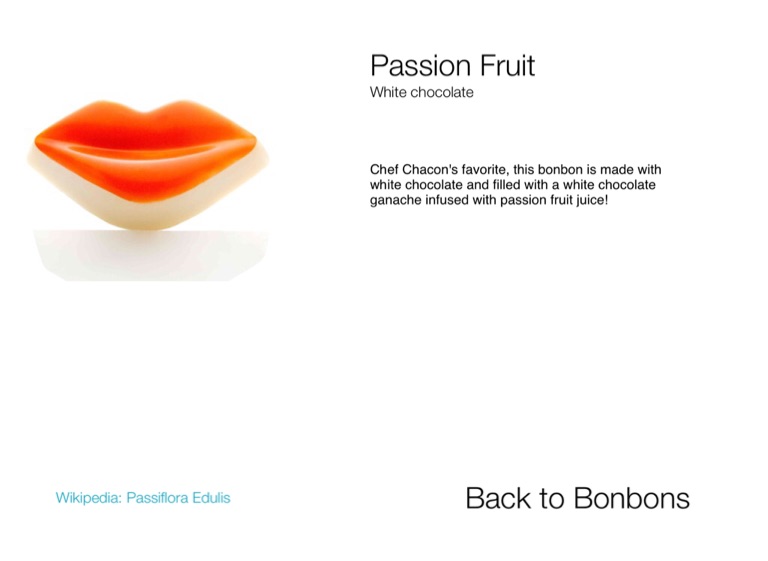 Chef Chacon's favorite, this bonbon is made with white chocolate and filled with a white chocolate ganache infused with passion fruit juice!
