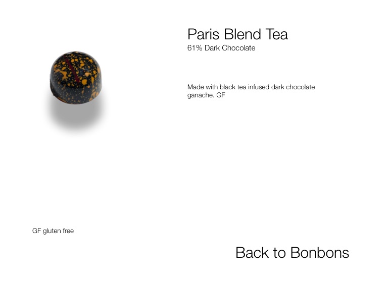 Made with black tea infused dark chocolate ganache. GF