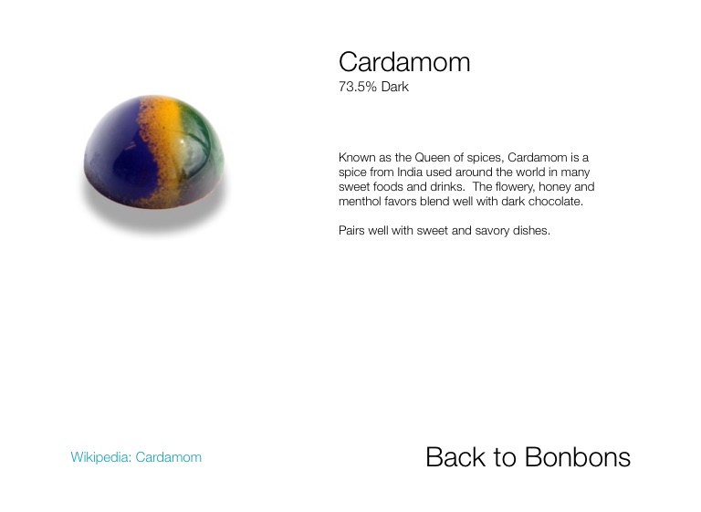 Known as the Queen of spices, Cardamom is a spice from India used around the world in many sweet foods and drinks. The flowery, honey and menthol favors blend well with dark chocolate.