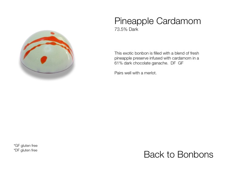 This exotic bonbon is filled with a blend of fresh pineapple preserve infused with cardamom in a 61% dark chocolate ganache. DF GF