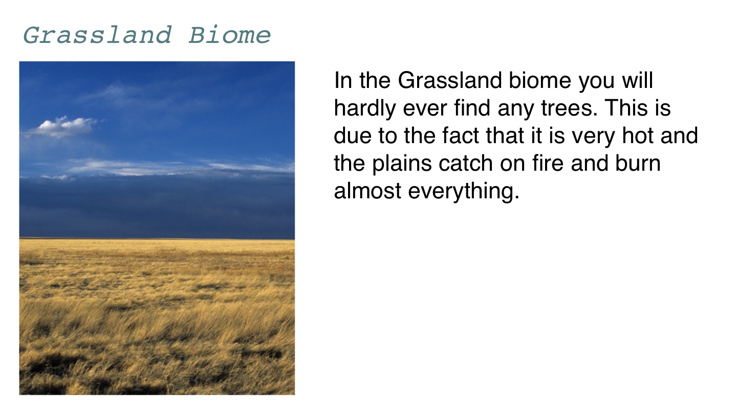 In the Grassland biome you will hardly ever find any trees. This is due to the fact that it is very hot and the plains catch on fire and burn almost everything.