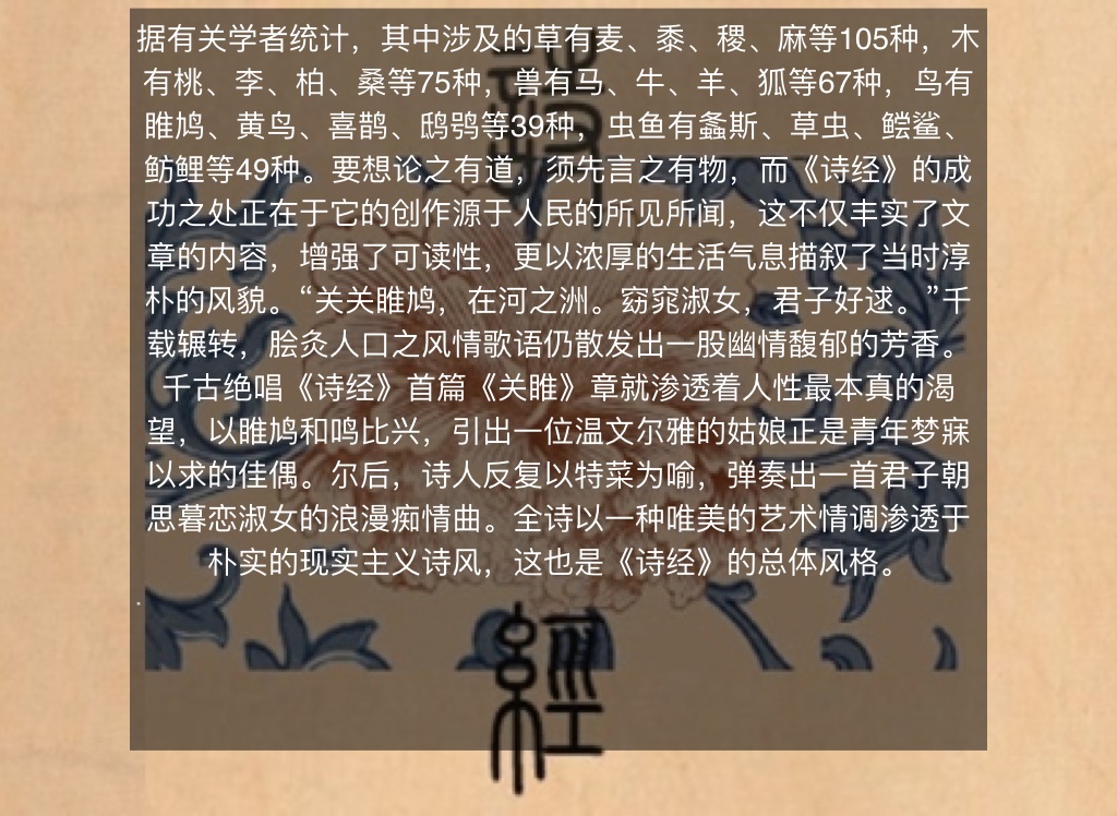 据有关学者统计,其中涉及的草有麦、黍、稷、麻等105种,木有桃、李、柏、桑等75种,兽有马、牛、羊、狐等67种,鸟有睢鸠、黄鸟、喜鹊、鸱鸮等39种,虫鱼有螽斯、草虫、鲿鲨、鲂鲤等49种。要想论之有道,须先言之有物,而《诗经》的成功之处正在于它的创作源于人民的所见所闻,这不仅丰实了文章的内容,增强了可读性,更以浓厚的生活气息描叙了当时淳朴的风貌。“关关睢鸠,在河之洲。窈窕淑女,君子好逑。”千载辗转,脍灸人口之风情歌语仍散发出一股幽情馥郁的芳香。千古绝唱《诗经》首篇《关睢》章就渗透着人性最本真的渴望,以睢鸠和鸣比兴,引出一位温文尔雅的姑娘正是青年梦寐以求的佳偶。尔后,诗人反复以特菜为喻,弹奏出一首君子朝思暮恋淑女的浪漫痴情曲。全诗以一种唯美的艺术情调渗透于朴实的现实主义诗风,这也是《诗经》的总体风格。