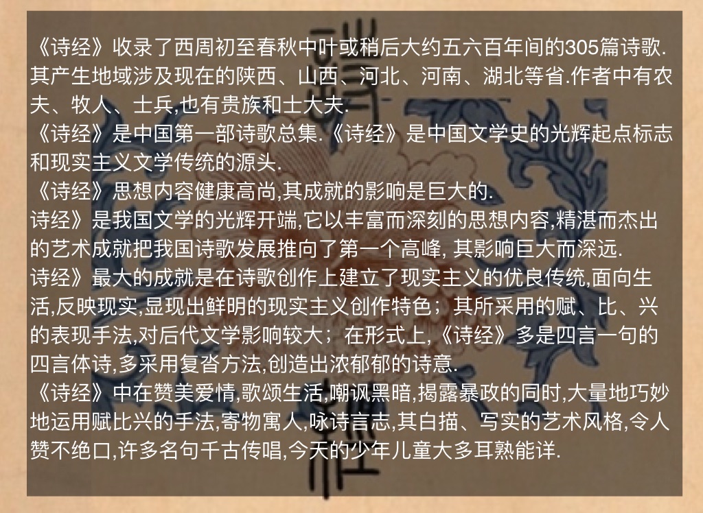 《诗经》中在赞美爱情,歌颂生活,嘲讽黑暗,揭露暴政的同时,大量地巧妙地运用赋比兴的手法,寄物寓人,咏诗言志,其白描、写实的艺术风格,令人赞不绝口,许多名句千古传唱,今天的少年儿童大多耳熟能详.