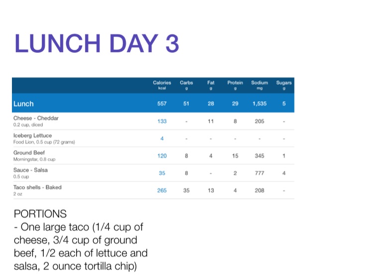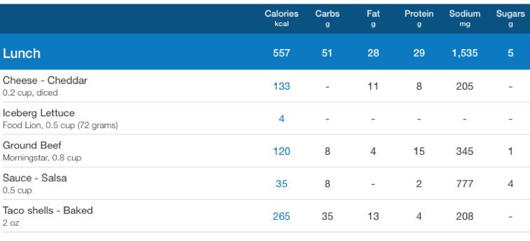 - One large taco (1/4 cup of cheese, 3/4 cup of ground beef, 1/2 each of lettuce and salsa, 2 ounce tortilla chip)