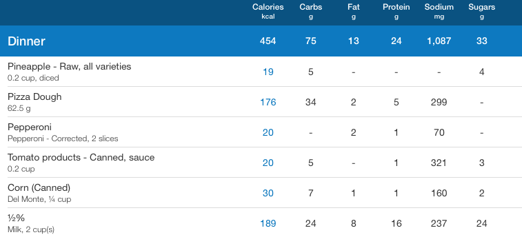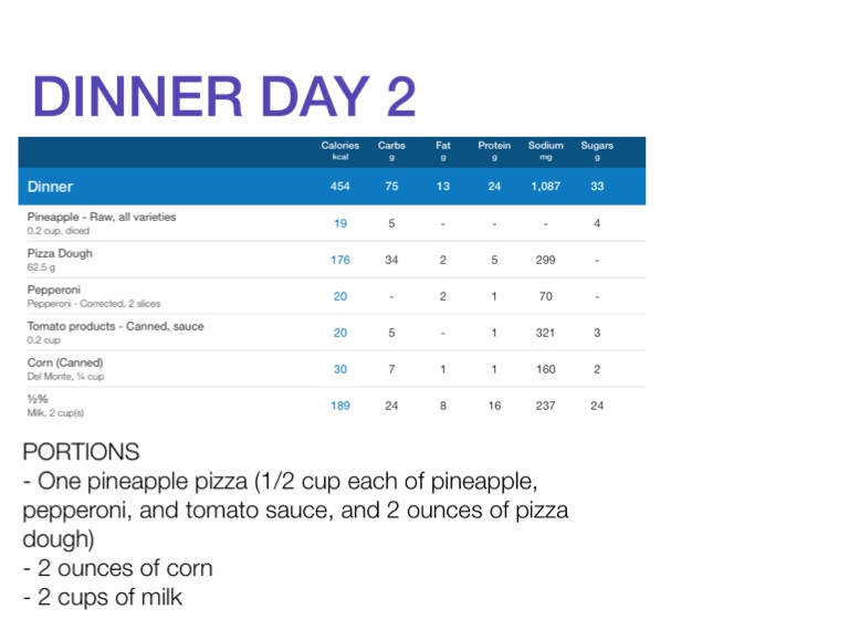 - One pineapple pizza (1/2 cup each of pineapple, pepperoni, and tomato sauce, and 2 ounces of pizza dough)