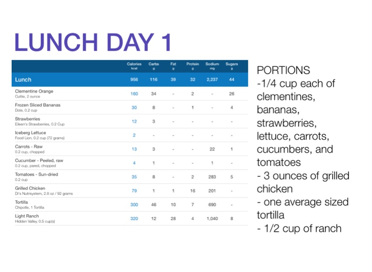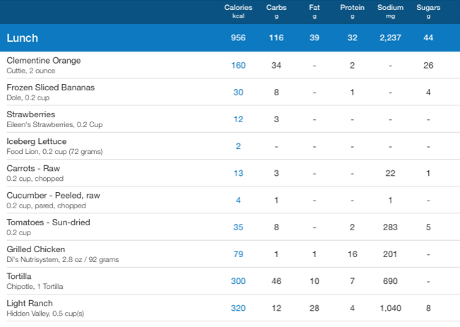 -1/4 cup each of clementines, bananas, strawberries, lettuce, carrots, cucumbers, and tomatoes
