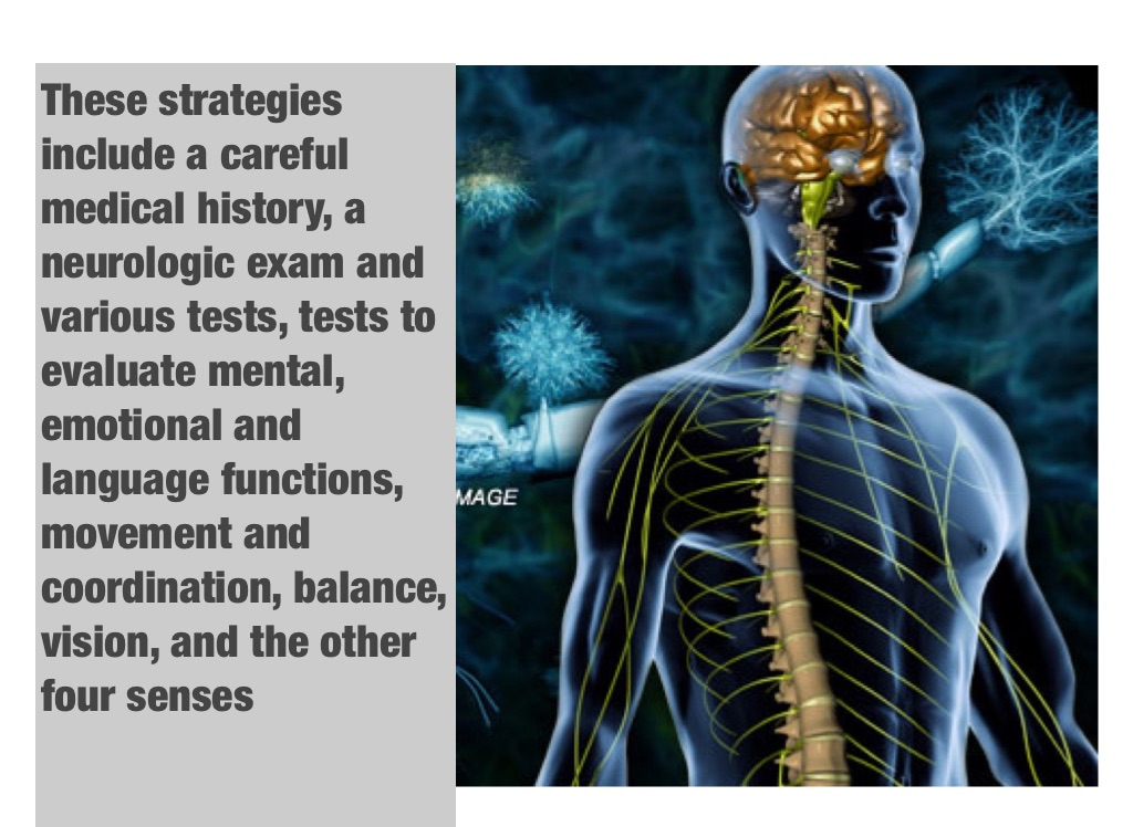 These strategies include a careful medical history, a neurologic exam and various tests, tests to evaluate mental, emotional and language functions, movement and coordination, balance, vision, and the other four senses
