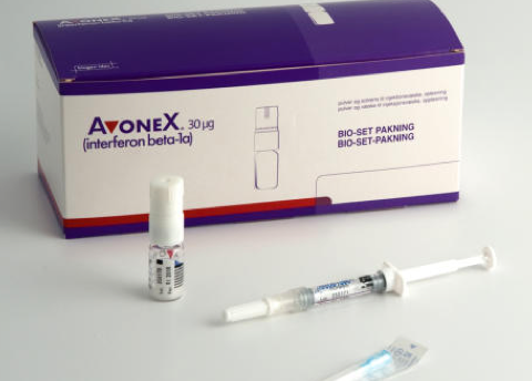 Interferon beta-1a (Avonex). Given as weekly intramuscular injections.