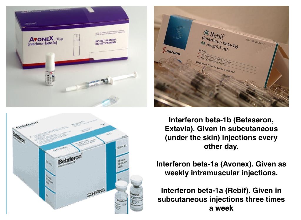 Interferon beta-1b (Betaseron, Extavia). Given in subcutaneous (under the skin) injections every other day.