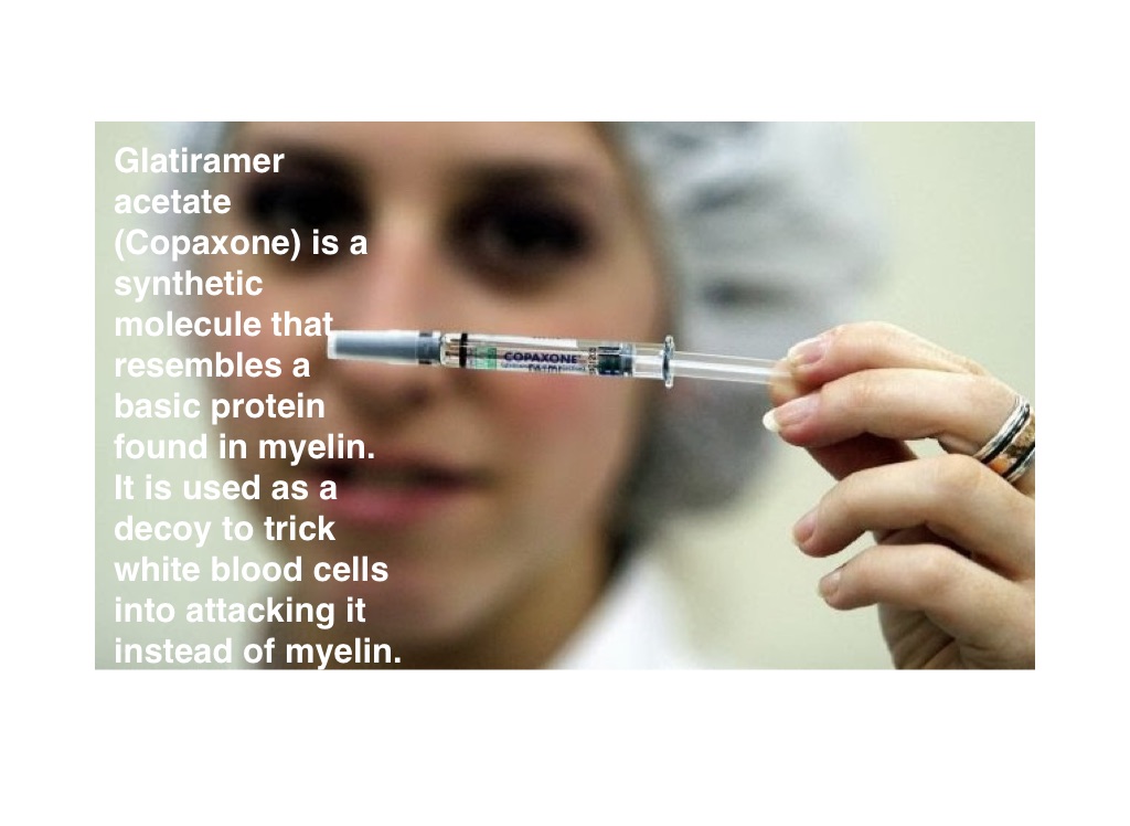 Glatiramer acetate (Copaxone) is a synthetic molecule that resembles a basic protein found in myelin. It is used as a decoy to trick white blood cells into attacking it instead of myelin.