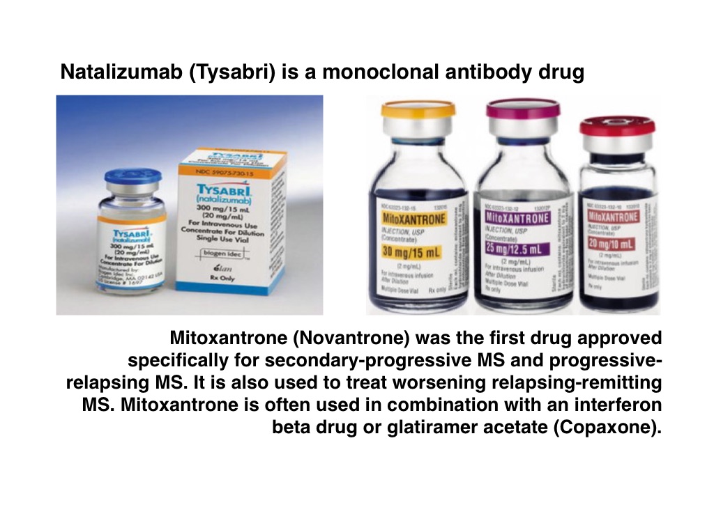Mitoxantrone (Novantrone) was the first drug approved specifically for secondary-progressive MS and progressive-relapsing MS. It is also used to treat worsening relapsing-remitting MS. Mitoxantrone is often used in combination with an interferon beta drug or glatiramer acetate (Copaxone).
