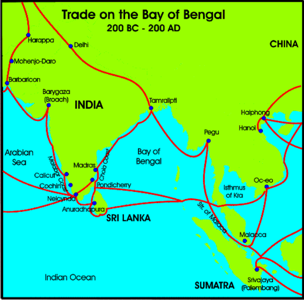 The Bay of Bengal, Indian Ocean, Arabian Sea, and South China Sea were the bodies of water mainly used in Indian trade. Some key trade routes was from Masulpitam to Sumatra and quilon to Mombasa.