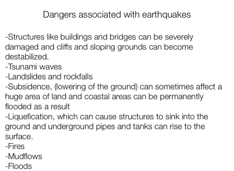 -Liquefication, which can cause structures to sink into the ground and underground pipes and tanks can rise to the surface.