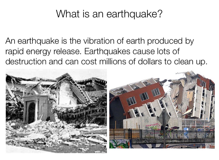 An earthquake is the vibration of earth produced by rapid energy release. Earthquakes cause lots of destruction and can cost millions of dollars to clean up.