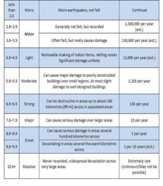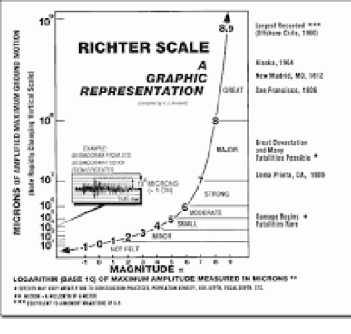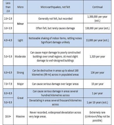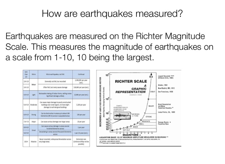 Earthquakes are measured on the Richter Magnitude Scale. This measures the magnitude of earthquakes on a scale from 1-10, 10 being the largest.