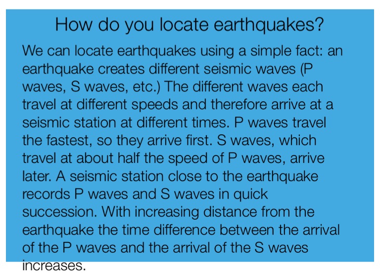 We can locate earthquakes using a simple fact: an earthquake creates different seismic waves (P waves, S waves, etc.) The different waves each travel at different speeds and therefore arrive at a seismic station at different times. P waves travel the fastest, so they arrive first. S waves, which travel at about half the speed of P waves, arrive later. A seismic station close to the earthquake records P waves and S waves in quick succession. With increasing distance from the earthquake the time difference between the arrival of the P waves and the arrival of the S waves increases.