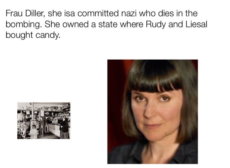 Frau Diller, she isa committed nazi who dies in the bombing. She owned a state where Rudy and Liesal bought candy.