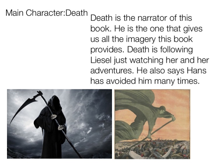 Death is the narrator of this book. He is the one that gives us all the imagery this book provides. Death is following Liesel just watching her and her adventures. He also says Hans has avoided him many times.