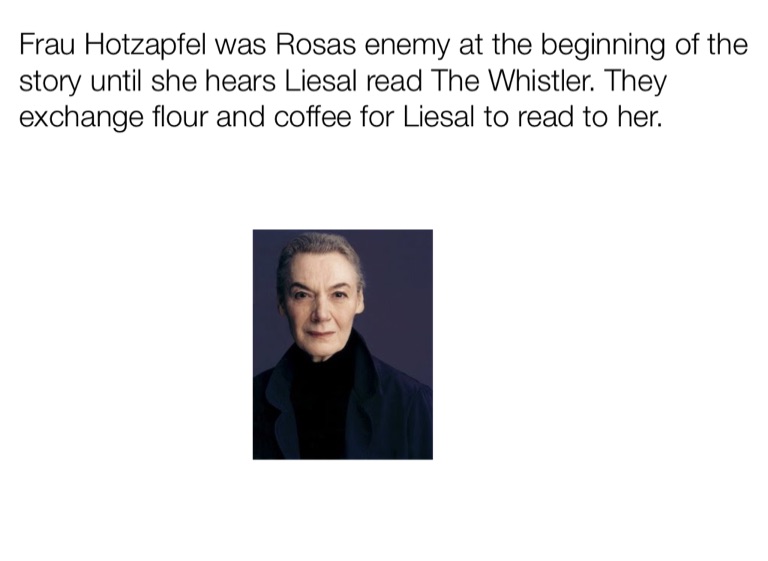 Frau Hotzapfel was Rosas enemy at the beginning of the story until she hears Liesal read The Whistler. They exchange flour and coffee for Liesal to read to her.