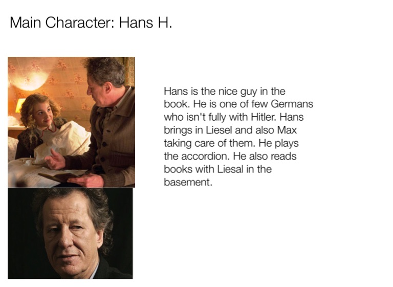Hans is the nice guy in the book. He is one of few Germans who isn't fully with Hitler. Hans brings in Liesel and also Max taking care of them. He plays the accordion. He also reads books with Liesal in the basement.
