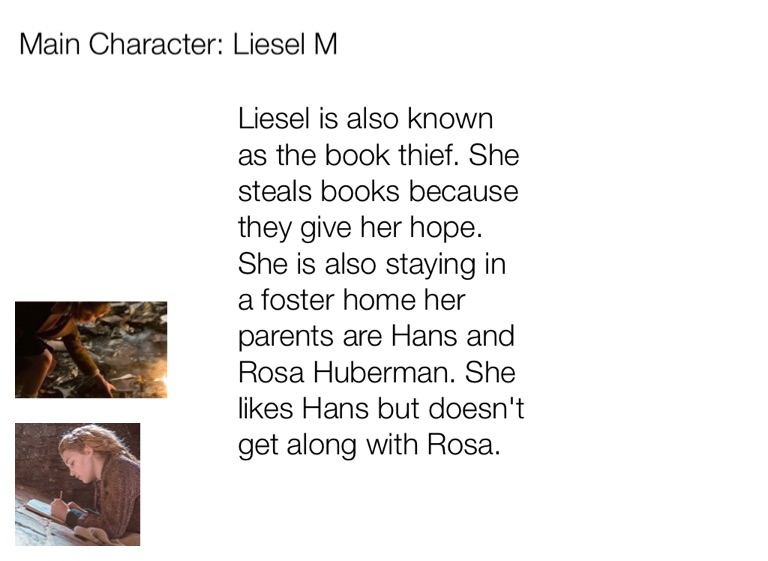 Liesel is also known as the book thief. She steals books because they give her hope. She is also staying in a foster home her parents are Hans and Rosa Huberman. She likes Hans but doesn't get along with Rosa.