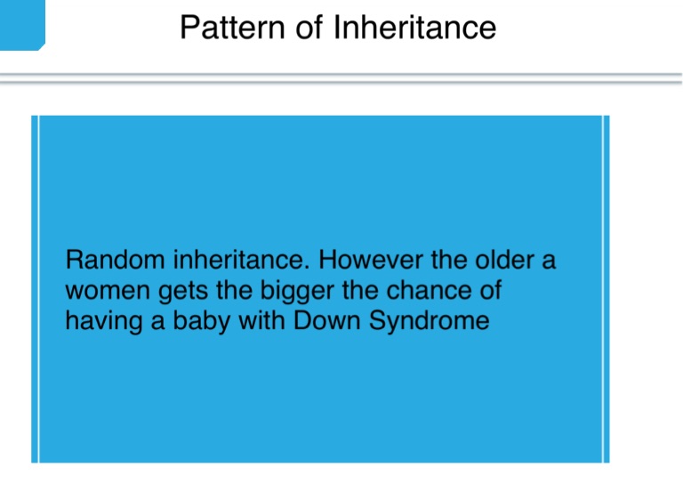 Random inheritance. However the older a women gets the bigger the chance of having a baby with Down Syndrome