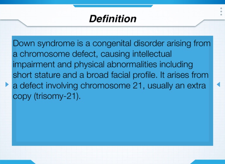Down syndrome is a congenital disorder arising from a chromosome defect, causing intellectual impairment and physical abnormalities including short stature and a broad facial profile. It arises from a defect involving chromosome 21, usually an extra copy (trisomy-21).