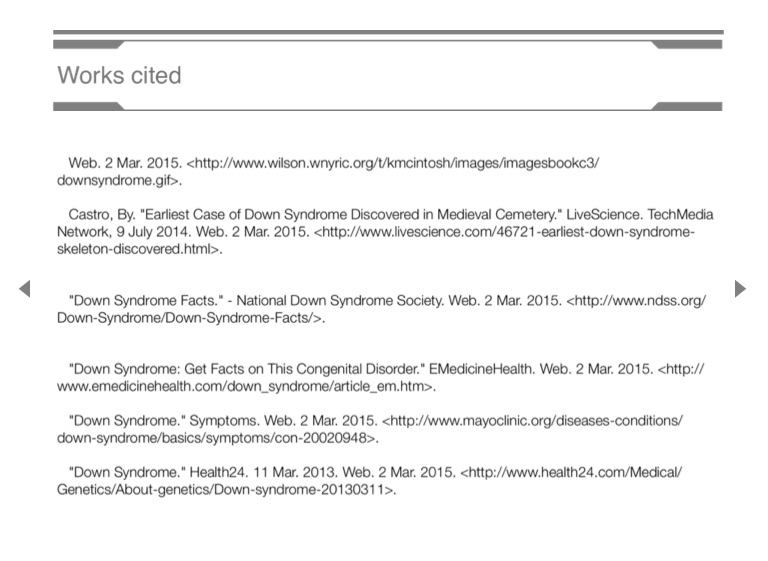 "Down Syndrome." Symptoms. Web. 2 Mar. 2015. <http://www.mayoclinic.org/diseases-conditions/down-syndrome/basics/symptoms/con-20020948>.