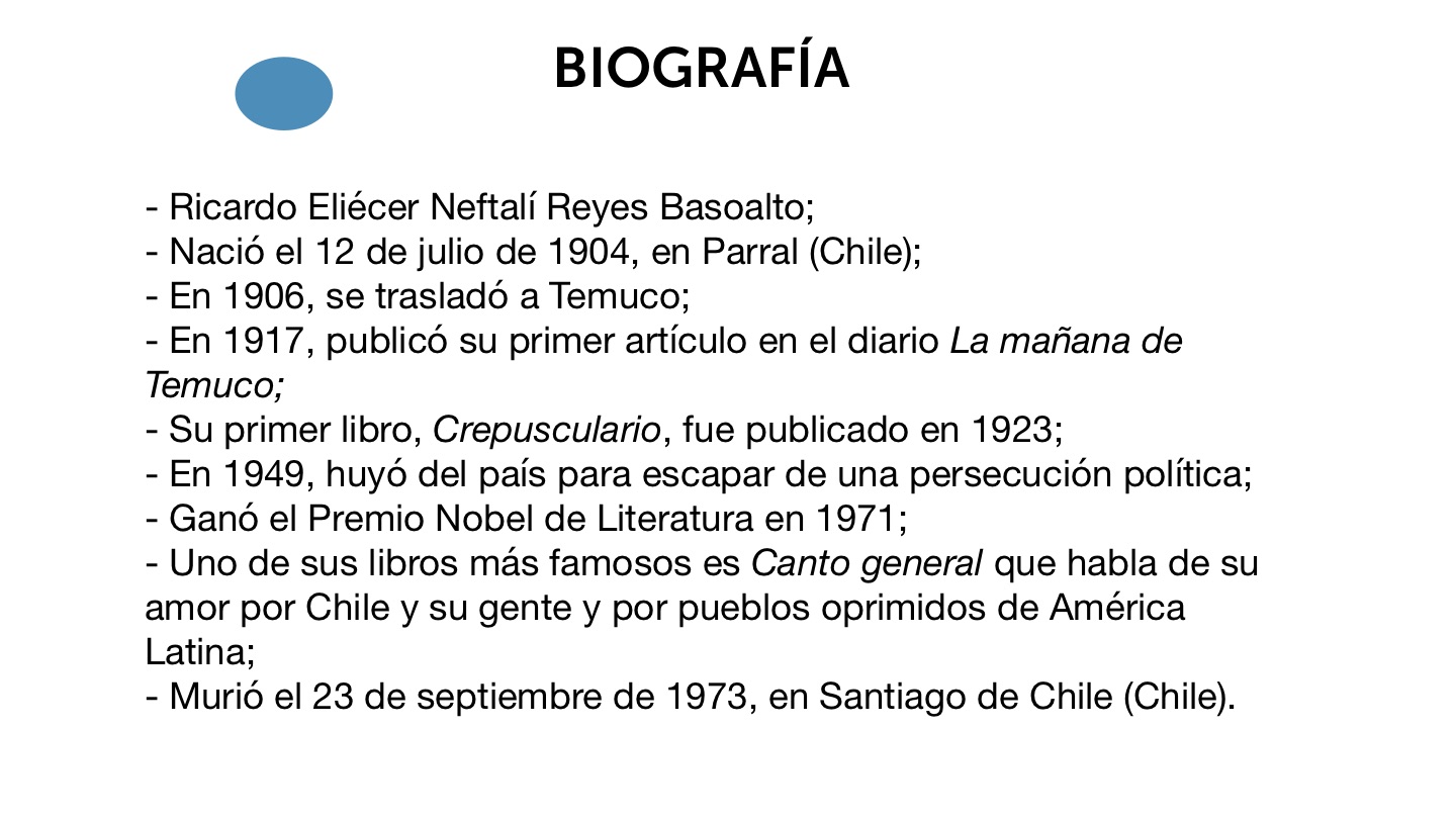 - Uno de sus libros más famosos es Canto general que habla de su amor por Chile y su gente y por pueblos oprimidos de América Latina;