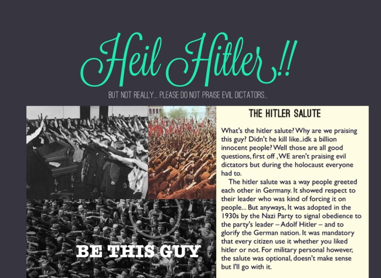 What's the hitler salute? Why are we praising this guy? Didn't he kill like..idk a billion innocent people? Well those are all good questions, first off , WE aren't praising evil dictators but during the holocaust everyone had to.