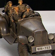 On the top is a small model of hitler and his soldiers and below is a small airplane made from scrap metal