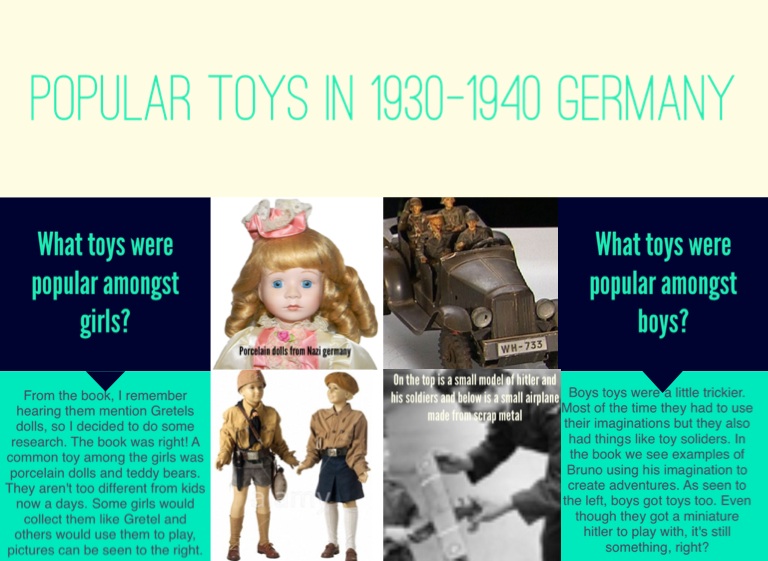 Boys toys were a little trickier. Most of the time they had to use their imaginations but they also had things like toy soliders. In the book we see examples of Bruno using his imagination to create adventures. As seen to the left, boys got toys too. Even though they got a miniature hitler to play with, it's still something, right?