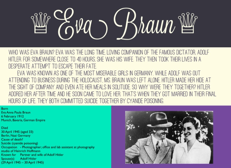 Who was Eva Braun? Eva was the long time, loving companion of the famous dictator, Adolf hitler. For somewhere close to 40 hours, she was his wife. They then took their lives in a desperate attempt to escape their fate.