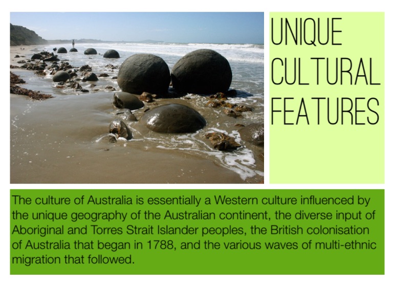 The culture of Australia is essentially a Western culture influenced by the unique geography of the Australian continent, the diverse input of Aboriginal and Torres Strait Islander peoples, the British colonisation of Australia that began in 1788, and the various waves of multi-ethnic migration that followed.