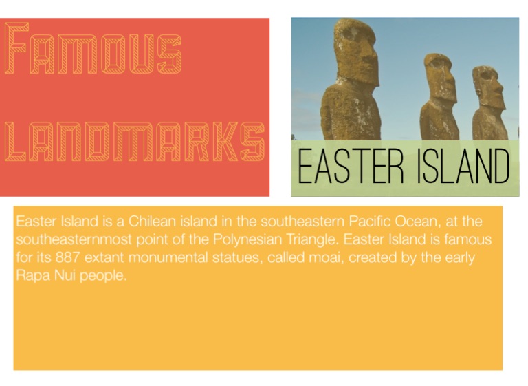 Easter Island is a Chilean island in the southeastern Pacific Ocean, at the southeasternmost point of the Polynesian Triangle. Easter Island is famous for its 887 extant monumental statues, called moai, created by the early Rapa Nui people.