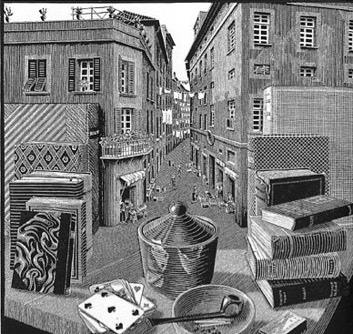- His first print of an impossible reality was " Still life and Street" a woodcut made in 1937.