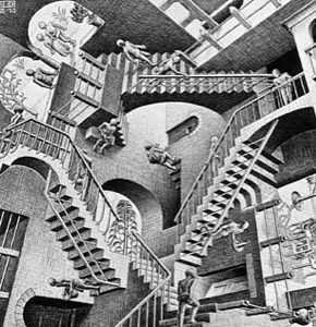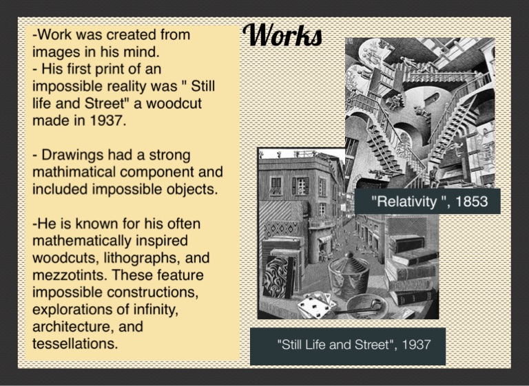 -He is known for his often mathematically inspired woodcuts, lithographs, and mezzotints. These feature impossible constructions, explorations of infinity, architecture, and tessellations.