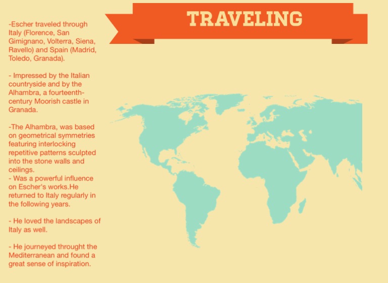 -Escher traveled through Italy (Florence, San Gimignano, Volterra, Siena, Ravello) and Spain (Madrid, Toledo, Granada).