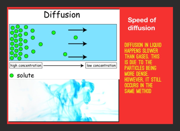 Diffusion in liquid happens slower than gases. This is due to the particles being more dense. However, it still occurs in the same method