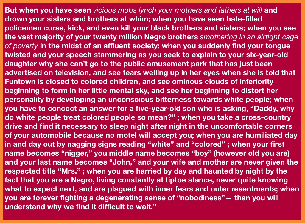 But when you have seen vicious mobs lynch your mothers and fathers at will and drown your sisters and brothers at whim; when you have seen hate-filled policemen curse, kick, and even kill your black brothers and sisters; when you see the vast majority of your twenty million Negro brothers smothering in an airtight cage of poverty in the midst of an affluent society; when you suddenly find your tongue twisted and your speech stammering as you seek to explain to your six-year-old daughter why she can’t go to the public amusement park that has just been advertised on television, and see tears welling up in her eyes when she is told that Funtown is closed to colored children, and see ominous clouds of inferiority beginning to form in her little mental sky, and see her beginning to distort her personality by developing an unconscious bitterness towards white people; when you have to concoct an answer for a five-year-old son who is asking, “Daddy, why do white people treat colored people so mean?” ; when you take a cross-country drive and find it necessary to sleep night after night in the uncomfortable corners of your automobile because no motel will accept you; when you are humiliated day in and day out by nagging signs reading “white” and “colored” ; when your first name becomes “nigger,” you middle name becomes “boy” (however old you are) and your last name becomes “John,” and your wife and mother are never given the respected title “Mrs.” ; when you are harried by day and haunted by night by the fact that you are a Negro, living constantly at tiptoe stance, never quite knowing what to expect next, and are plagued with inner fears and outer resentments; when you are forever fighting a degenerating sense of “nobodiness”— then you will understand why we find it difficult to wait.”