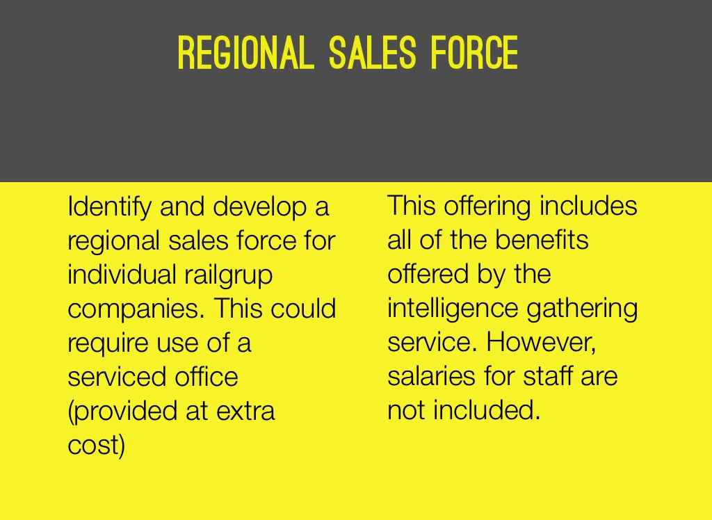 Identify and develop a regional sales force for individual railgrup companies. This could require use of a serviced office (provided at extra cost)
