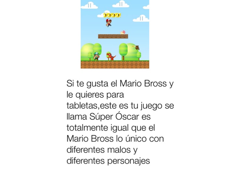 Si te gusta el Mario Bross y le quieres para tabletas,este es tu juego se llama Súper Óscar es totalmente igual que el Mario Bross lo único con diferentes malos y diferentes personajes