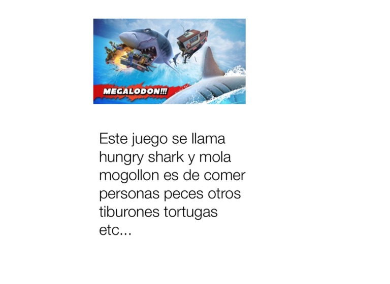 Este juego se llama hungry shark y mola mogollon es de comer personas peces otros tiburones tortugas etc...