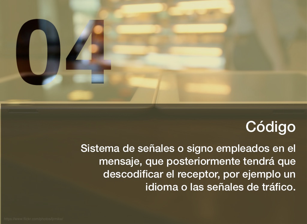 Sistema de señales o signo empleados en el mensaje, que posteriormente tendrá que descodificar el receptor, por ejemplo un idioma o las señales de tráfico.