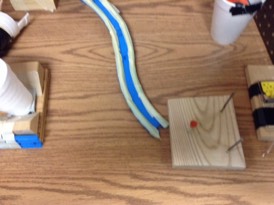 2. Rolls down track into foam cup