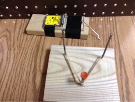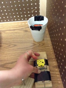 7. Bail of mousetrap pulls strings tight to pull weighted cup onto buzzer
