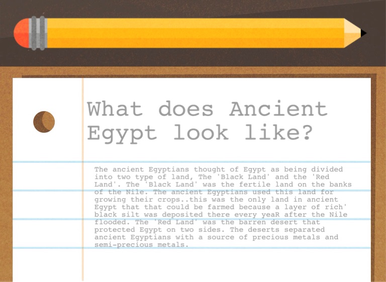 The ancient Egyptians thought of Egypt as being divided into two type of land, The 'Black Land' and the 'Red Land'. The 'Black Land' was the fertile land on the banks of the Nile. The ancient Egyptians used this land for growing their crops..this was the only land in ancient Egypt that that could be farmed because a layer of rich' black silt was deposited there every yeaR after the Nile flooded. The 'Red Land' was the barren desert that protected Egypt on two sides. The deserts separated ancient Egyptians with a source of precious metals and semi-precious metals.