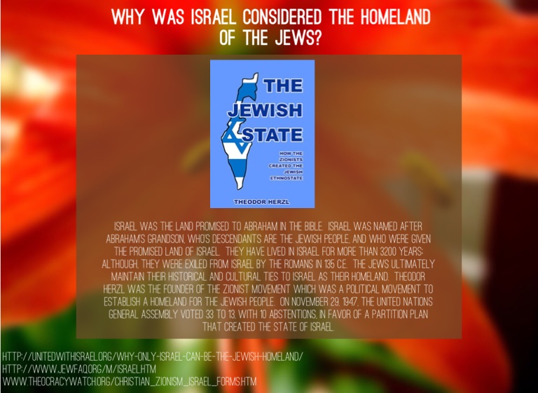 Israel was the land promised to Abraham in the bible. Israel was named after Abraham's grandson, who's descendants are the Jewish people, and who were given the promised land of Israel. They have lived in Israel for more than 3200 years; Although, they were exiled from Israel by the Romans in 135 C.E. The Jews ultimately maintain their historical and cultural ties to Israel as their homeland. Theodor Herzl was the founder of the Zionist movement which was a political movement to establish a homeland for the Jewish people. On November 29, 1947, the United Nations General Assembly voted 33 to 13, with 10 abstentions, in favor of a Partition Plan that created the State of Israel.