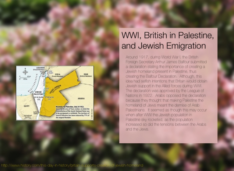 Around 1917, during World War I, the British Foreign Secretary Arthur James Balfour submitted a declaration stating the importance of creating a Jewish homeland present in Palestine, thus creating the Balfour Declaration. Although, this idea had selfish intentions that Britain would obtain Jewish support in the Allied forces during WWI. The declaration was approved by the League of Nations in 1922. Arabs opposed the declaration because they thought that making Palestine the homeland of Jews meant the demise of Arab Palestinians. It seemed as though this may occur when after WWI the Jewish population in Palestine sky rocketed, as the population increased so did the tensions between the Arabs and the Jews.