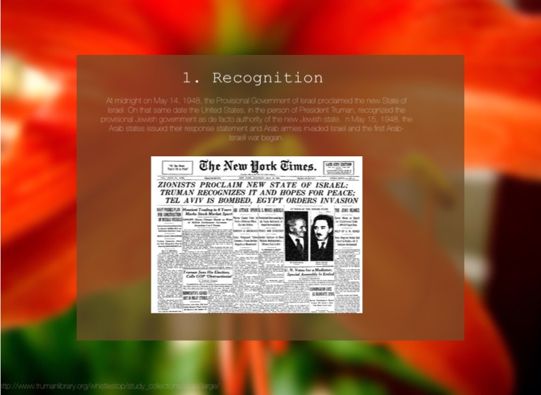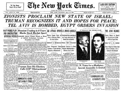At midnight on May 14, 1948, the Provisional Government of Israel proclaimed the new State of Israel. On that same date the United States, in the person of President Truman, recognized the provisional Jewish government as de facto authority of the new Jewish state. n May 15, 1948, the Arab states issued their response statement and Arab armies invaded Israel and the first Arab-Israeli war began.